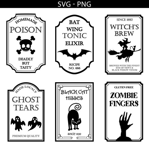 Witch Potion Labels | Halloween Labels Apothecary Bundle A magical and spooky vintage ingredients label set ready to assist you in your Halloween Witchcraft projects. THE BUNDLE CONTAINS: 1 ZIP file containing: 15 individual PNG labels with transparent background. 4 JPEG collage sheets of labels for easy printing - 8.5 x 11 inch. The 15 labels include: Baby Dragon Fire Breath; Bat Wings; Dragon's Blood