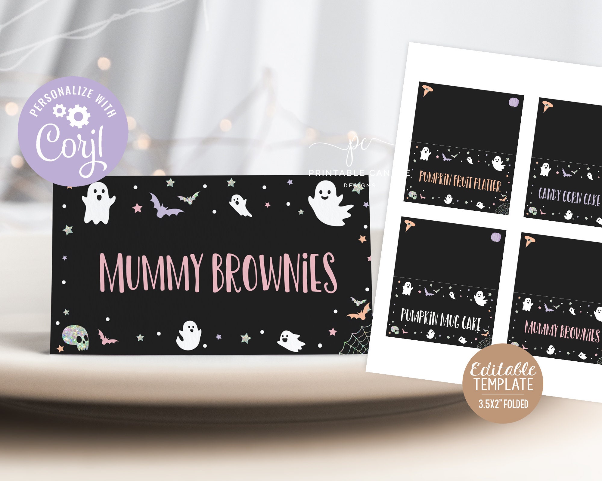 Printable Halloween Food Labels | Place Cards | Halloween Theme Party Get creative with your own Halloween themed food & drink names! You can also use as place cards by typing in names instead of food. Edit & print these printable Halloween Food Labels as often as you like. INCLUDED TEMPLATES Instructions PDF file with 4 x folding Labels per page. Each label is 3⅓ x 2½ inches once cut & folded. Pin HOW IT WORKS
